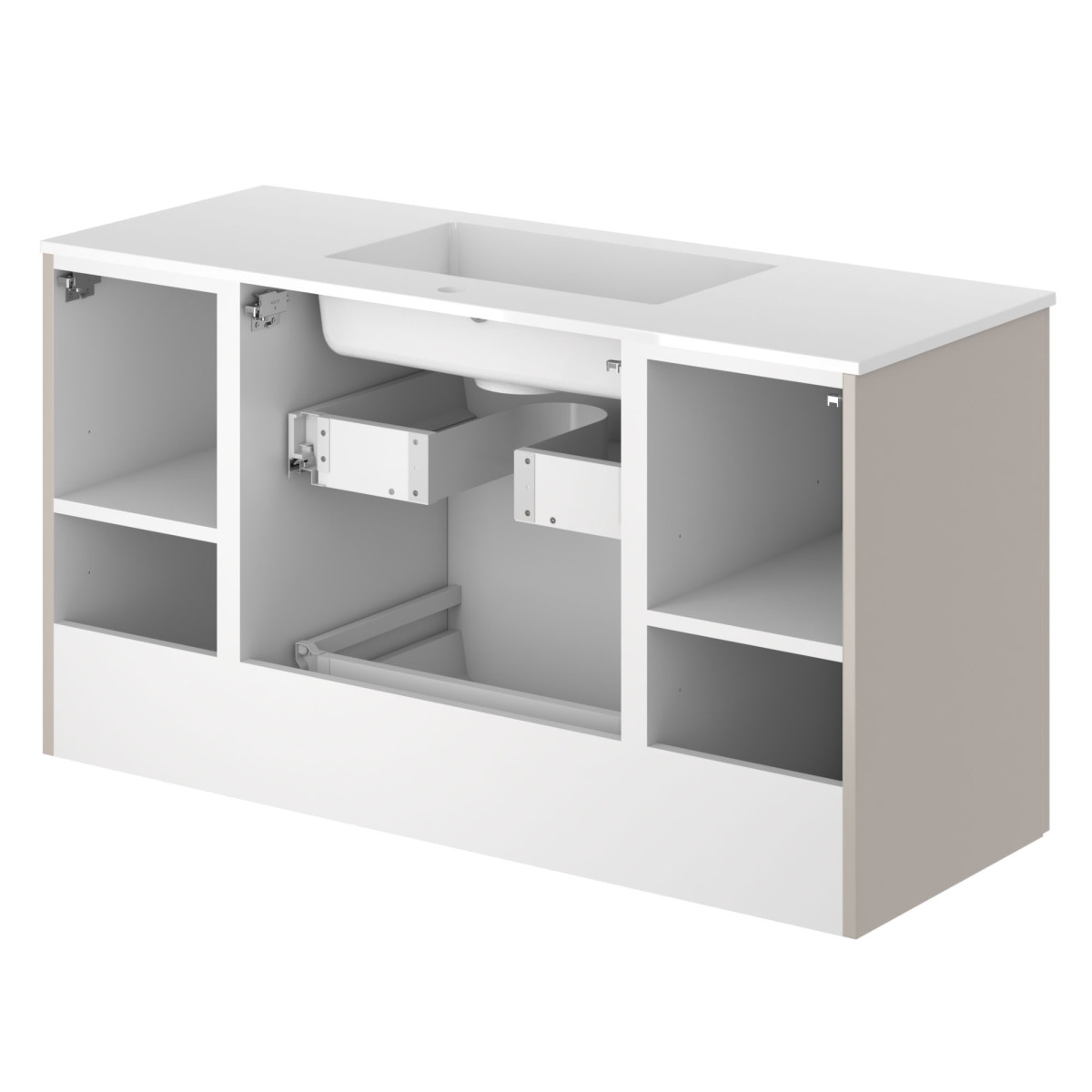 Całości dopełnia umywalka, wykonana z dolomitu (zwanego lanym marmurem) o nowoczesnym wyglądzie oraz dużej wytrzymałości w kolorze śnieżnobiałym.