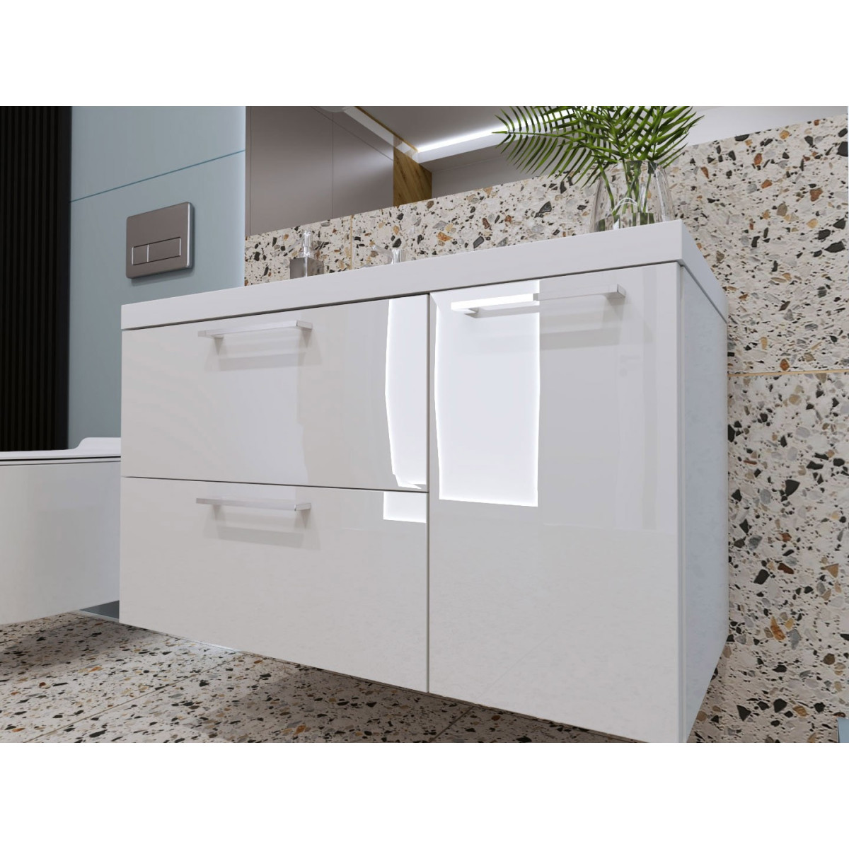 Szafka łazienkowa o nowoczesnym wzornictwie z szufladami z cichym domykaniem polakierowana na wysoki połysk.